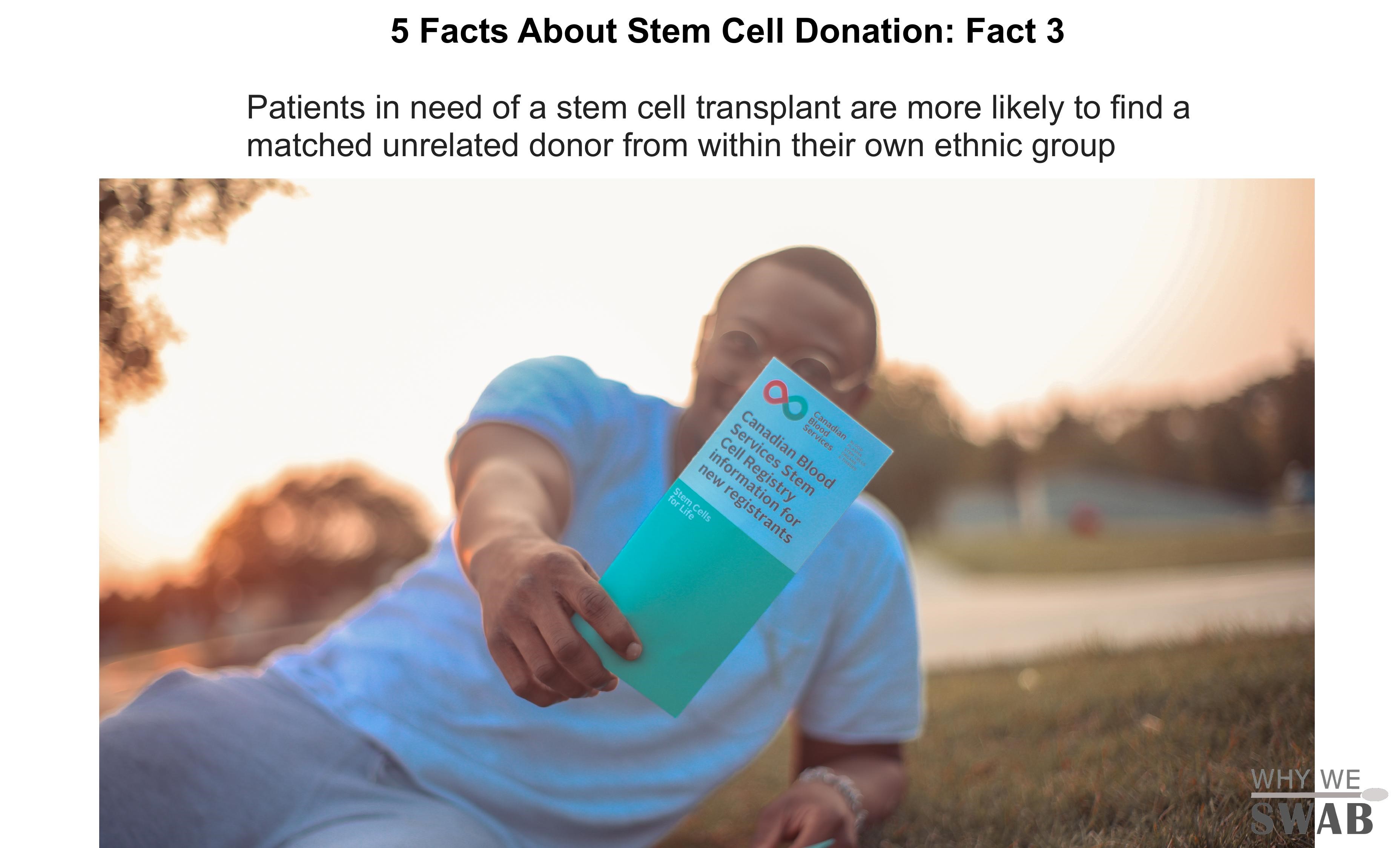 Patients who need a stem cell transplant are more likely to find a suitable donor from someone of the same ethnic background. However, less than 3% of registered donors are Black whereas 70% are Caucasian! This means that Black patients who are in need of a stem cell transplant to save their life are less likely to find a match! This is why it is so important that we recruit more Black donors so that we can have an ethnically diverse registry to help increase the chance that patients are able to find a donor.
